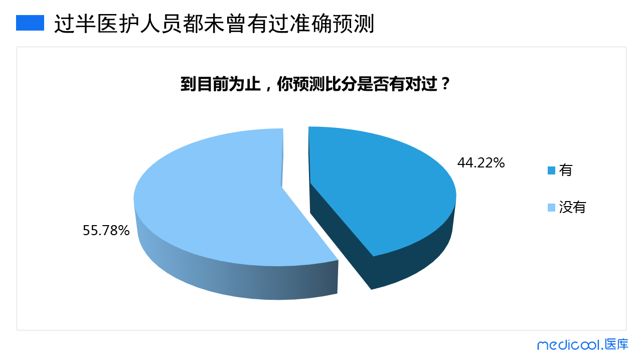 而在参与调研的医护中,仅有44.22%的医护曾准确预测比分数,超过一半的医护都未曾预测准确过,果然是“重在参与”地观看一下!
