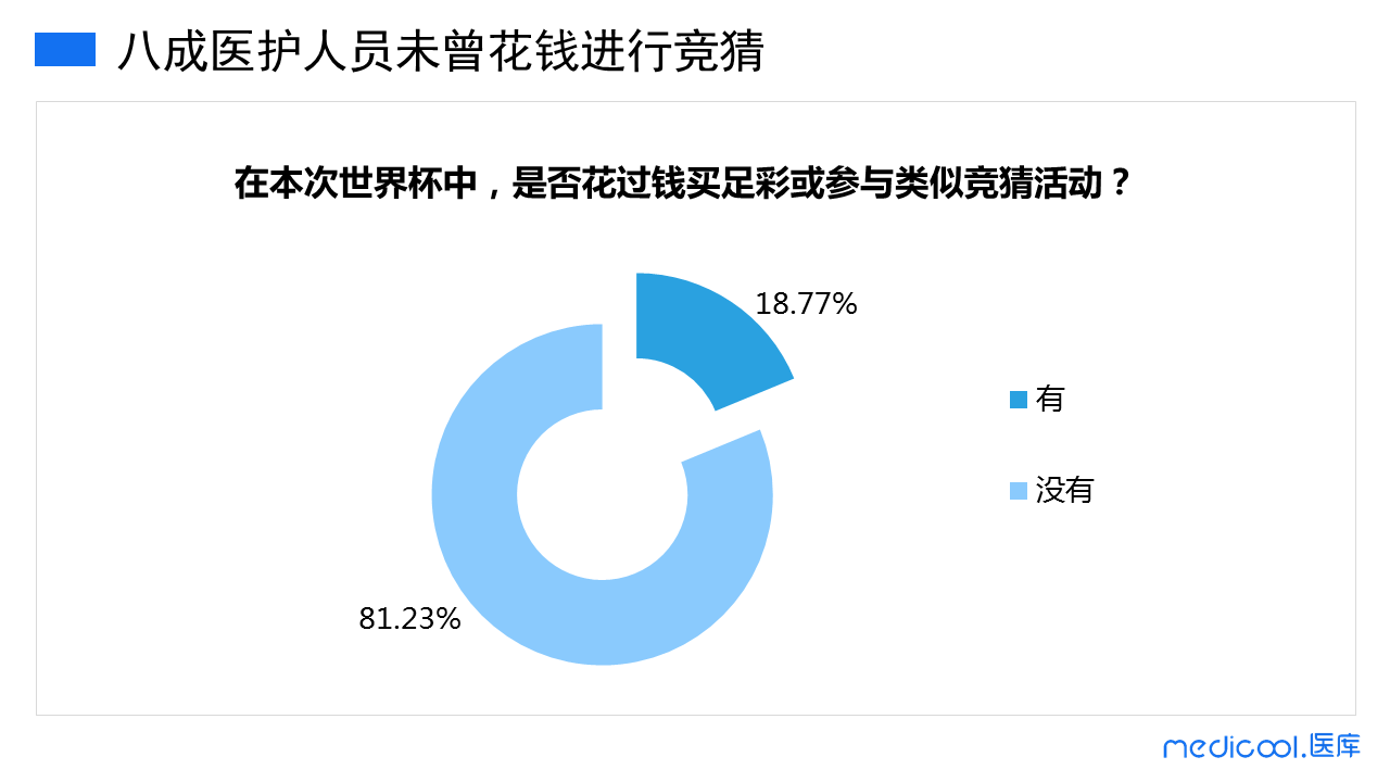 随着世界杯的开始,足彩的热度也节节攀升,各路足球竞猜的app更是多如牛毛,但是八成的医护在世界杯期间不曾花过一分钱在此类竞猜上,仅有18.77%的医护有花钱竞猜的经历,不知他们是否有赚回本钱呢?