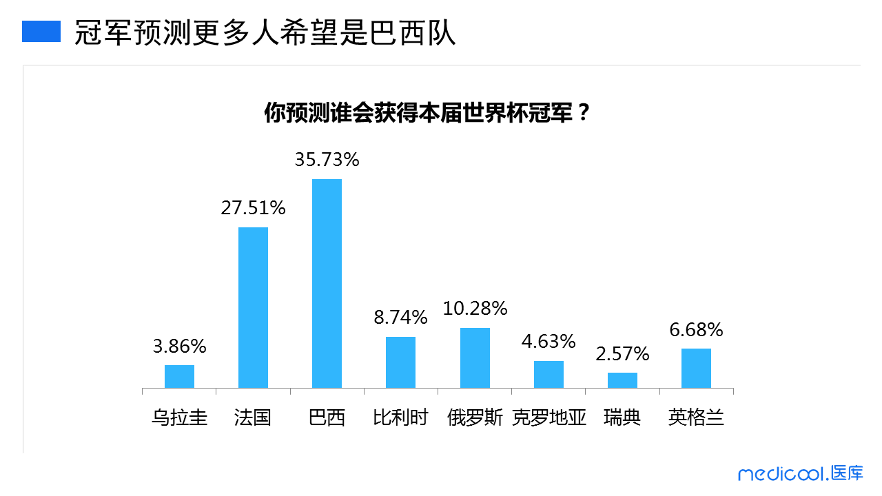现在的我们已经知道本届世界杯冠军是高卢雄鸡法国队,但在调研期间,比赛正在如火如荼的进行中,五星巴西作为老牌劲旅,被35.73%的医护们寄予厚望,觉得能夺得冠军,而27.51%的医护们压中了最后的冠军法国队,俄罗斯作为东道主也得到了10.28%的医护们的支持。