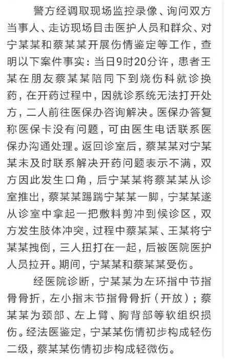 根据西城警方相关通报:查明以下案件事实,据此,西城警方对蔡某某、王某以涉嫌故意伤害罪依法刑事拘留;对医生宁某某以殴打他人裁决行政拘留 10 日并处罚款 200元。