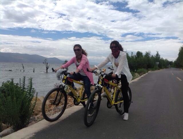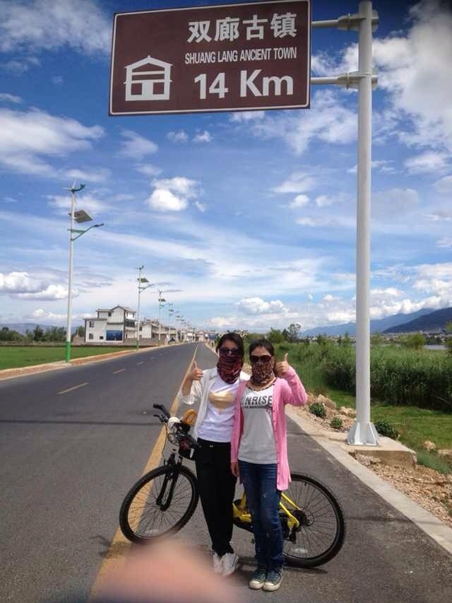 喜欢旅行的小伙伴们应该都知道,大理自古就是个诗情画意的地方,“风花雪月”指的就是大理四景——上关风、下关花、苍山雪、洱海月。到大理的第一天逛古城,吃小吃,云南的水果是真的又多又便宜!花个10块钱绝对能让你吃到撑。晚上住在青年旅社,和屋子里的小伙伴讨论该怎么玩,发现好几个人准备租车环洱海一圈。几个已经去过双廊古镇的童鞋拿出他们一路拍的美景,真真是蓝天碧水,感觉整颗心都是自由的。洱海骑行,真的好诱人,可是想想一圈下来的130公里的路程又有些胆怯,长这么大从没骑过这么远的路!最后在同行小伙伴们的劝说诱惑下,毅然决然的走上了“不归路”。跟着舍友一起租好山地车,买好骑巾,准备好太阳镜和防晒霜,带上钱,把其余的东西寄存在旅社我们就这么轻装上阵了。