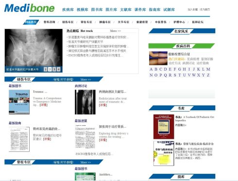 网站主要分为“创伤专区”、“脊柱专区”、“肿瘤专区”、“关节专区”、“关节专区”、“重建修复”、“中医骨伤”、“护理中心”、“骨科咨询”、“医师论坛”九大模块。前六大模块以学术科研教学为主,为广大骨科医师提供有价值的临床科研资料。“护理中心”主要提供了护理的相关知识,“骨科咨询”可供患者咨询服务,“医师论坛”则为广大医师之间的学习交流创建平台。另外,网站还设立资料库,包括疾病库、视频库、图书库、图片库、文献库、课件库、指南库和试题库,协助医师快速全面查找资料,帮助学生系统学习骨科知识。疾病库中整理了骨科疾病百科,可供查阅;视频库中加入了各类手术视频、教学视频,可供学习研究;图书库中提供了与骨科相关的图书资料;图片库中收集了与骨科类相关的图片;文献库中收纳骨科专业的名刊导读,可供选择;课件库中为骨科专家提供用于教学的最新课件;指南库可按拼音检索临床指南,查询临床治疗方案;试题库涵盖最新历年真题库、骨科考试题库、研究生专业试题库、本科专业试题库,面向广大骨科专业学生。